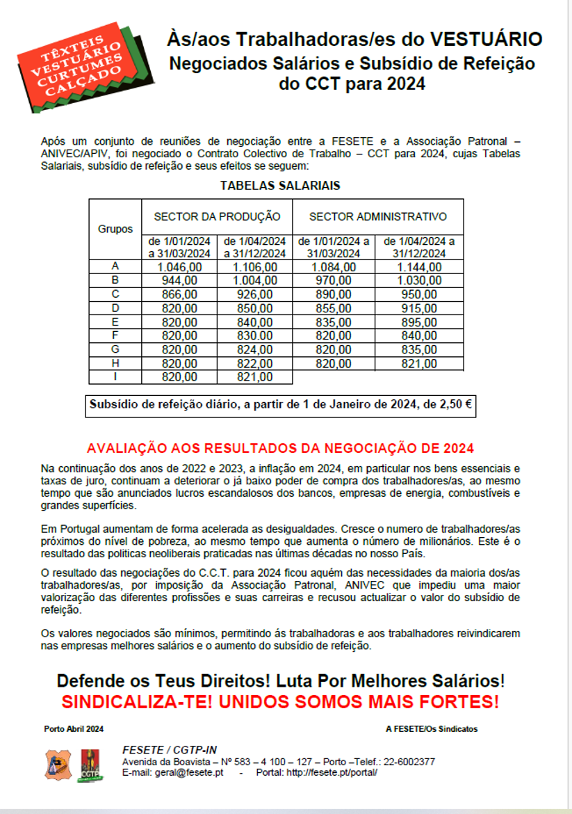 Aos Delegados/as Sindicais e a todos os trabalhadores/as do Sector do Vestuário, foi Acordada a Revisão do CCT Entre a ANIVEC/APIV e a FESETE e Sindicatos do Sector para 2024. Os valores acordados devem ser reivindicados pelos trabalhadores/as em todas as Empresas do Vestuário, para mais informações contacta o teu Delegado Sindical, ou diretamente para o Sindicato do Vestuário através dos telefones que constam na informação.
