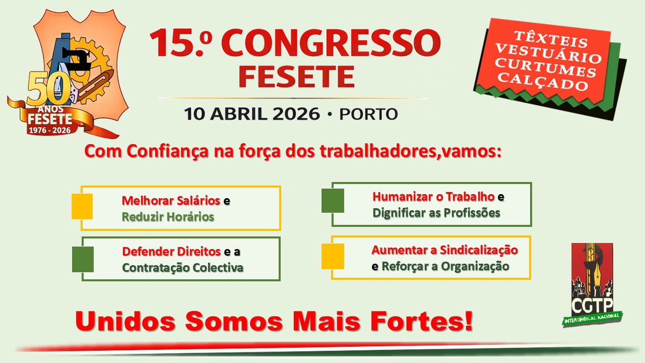 AOS/ÀS TRABALHADORES/AS DO VESTUÁRIO, CONFECÇÃO, E OUTROS, (TVCC), INFORMÁMOS QUE A NOSSA FEDERAÇAO, FESETE, EMITIU UM PRÉ-AVISO DE GREVE PARA O DIA 17 DE ABRIL COM O OBJETIVO DE PERMITIR A PARTICIPAÇÃO NA MANIFESTAÇÃO NACIONAL DE 17 DE ABRIL, EM LISBOA, CONTRA O PACOTE LABORAL!